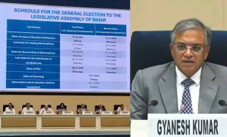 बिहार में दो चरणों में चुनाव होंगे। मुख्य चुनाव आयुक्त ज्ञानेश कुमार ने इसकी घोषणा कर दी है।। 6 नवंबर को पहले चरण का मतदान होगा। पहले चरण में 121 सीटों पर वोट डाले जाएंगे। पहले चरण के लिए 10 अक्टूबर दिन शुक्रवार को गजट नोटिफिकेशन जारी होगा। वहीं, 17 अक्टूबर, दिन शुक्रवार नामांकन की आखिरी तारीख होगी। 18 अक्टूबर, दिन शनिवार को को नामांकन पत्रों की जांच की जाएगी। वहीं, 20 अक्टूबर, सोमवार उम्मीदवारों के नाम वापस लेने की आखिरी तारीख होगी।
