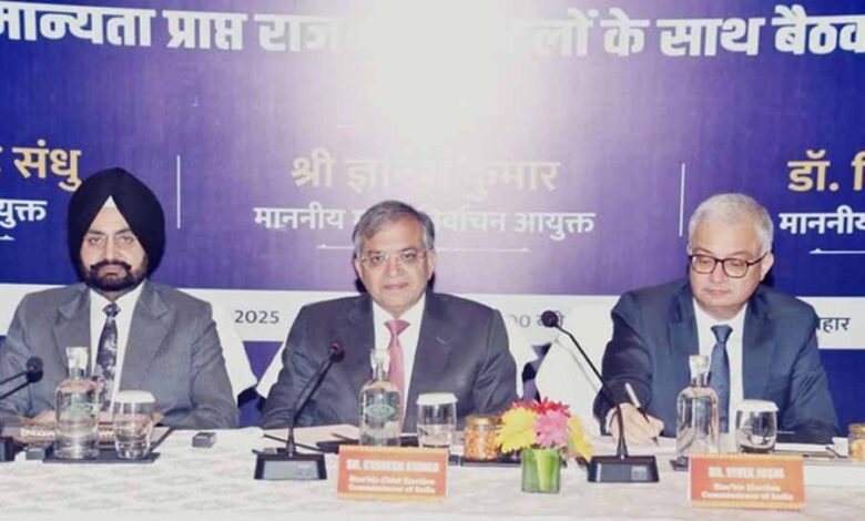 बिहार चुनाव की तारीखों का एलान होने में अब कुछ ही दिन शेष रह गए हैं। चुनाव की तैयारियों की अंतिम समीक्षा के लिए भारत निर्वाचन आयोग की टीम मुख्य चुनाव आयुक्त ज्ञानेश कुमार के नेतृत्व में पटना पहुंच चुकी है। उनके साथ चुनाव आयुक्त विवेक जोशी और एस. एस. संधू भी शुक्रवार देर रात पटना पहुंचे। चुनाव आयुक्त अपनी टीम के साथ दो दिन बिहार में रहेंगे। फिलहाल वह चुनाव की तैयारी में जुटे राजनीतिक दलों के साथ पटना के एक बड़े होटल में मीटिंग कर रहे। चुनाव आयोग की ओर से बताया गया कि मुख्य चुनाव आयुक्त ज्ञानेश कुमार की अध्यक्षता में चुनाव आयुक्त डॉ. सुखबीर सिंह संधु एवं चुनाव आयुक्त डॉ. विवेक जोशी, बिहार के मुख्य चुनाव अधिकारी विनोद गुंजियाल तथा आयोग के वरिष्ठ अधिकारियों के साथ बिहार के सभी 12 मान्यता प्राप्त राजनीतिक दलों के साथ बैठक कर रहे हैं।