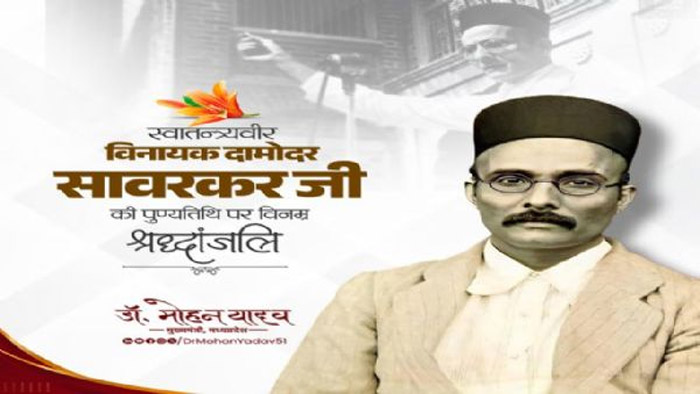 मुख्यमंत्री डॉ. मोहन यादव ने वीर विनायक दामोदर सावरकर की पुण्यतिथि पर उन्हें श्रद्धांजलि दी। मुख्यमंत्री डॉ. यादव ने कहा कि प्रखर राष्ट्रभक्त वीर सावरकर का जीवन भारतीय समाज के लिए त्याग और तपस्या की अनोखी मिसाल है। भारत की आजादी के कालखंड में वीर सावरकर ने राष्ट्र चेतना के लिए अपने कालजयी विचारों से 'स्व' के भाव की ज्योत जलाई थी। मुख्यमंत्री डॉ. यादव ने वीर सावरकर को नमन कर करते हुए कहा कि उनके विचार सदैव देशवासियों के लिए प्रेरणा का स्रोत रहेंगे।