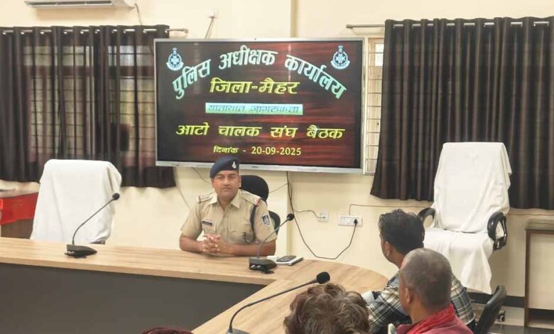 इसी क्रम में पुलिस अधीक्षक मैहर श्री अवधेश प्रताप सिंह के निर्देश पर यातायात जागरुकता हेतू आज दिनांक 20/09/25 को यातायात प्रभारी नृपेंद्र सिंह द्वारा पुलिस अधीक्षक कार्यालय के सभागार में ऑटो चालकों की मीटिंग लेकर उन्हें यातायात नियमों का पालन करने और सड़क सुरक्षा के महत्व के बारे में बताया गया। यातायात नियमों का पालन करना न केवल ऑटो चालकों बल्कि यात्री की सुरक्षा के लिए भी आवश्यक है। ऑटो चालकों को गति सीमा का पालन करने एवम सड़क पर सावधानी से वाहन चलाने की समझाइश दी गई।