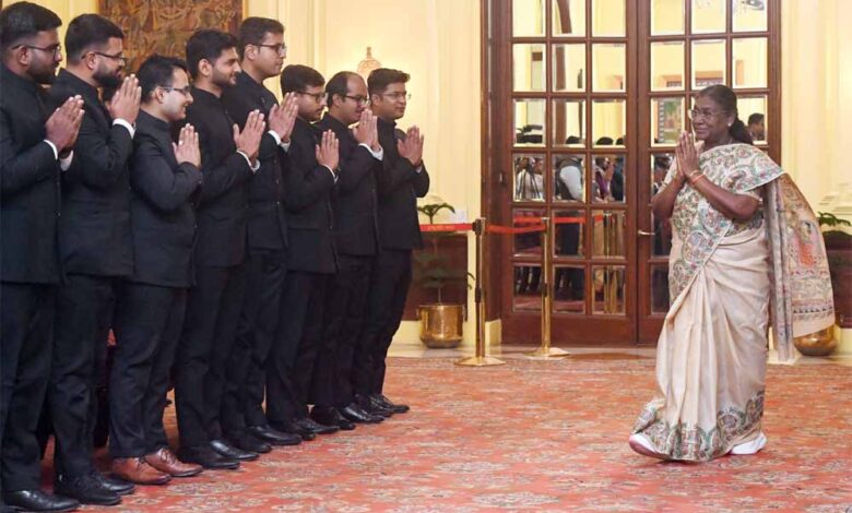 भारतीय विदेश सेवा (2024 बैच) के प्रशिक्षु अधिकारियों ने राष्ट्रपति द्रौपदी मुर्मू से मुलाकात की है। मंगलवार को यह मुलाकात राष्ट्रपति भवन में हुई। इस दौरान राष्ट्रपति मुर्मू ने अधिकारियों को भारतीय विदेश सेवा में शामिल होने के लिए बधाई दी। राष्ट्रपति द्रौपदी मुर्मू ने अनुरोध करते हुए कहा कि आप हमारे सभ्यतागत ज्ञान के मूल्यों (शांति, बहुलवाद, अहिंसा और संवाद) को अपने साथ लेकर चलें। साथ ही, अपने सामने आने वाली हर संस्कृति के विचारों, लोगों और दृष्टिकोणों के प्रति खुले रहें। उन्होंने अधिकारियों से कहा कि उन्हें अपने सामने आने वाली हर संस्कृति के विचारों, लोगों और दृष्टिकोणों के प्रति खुला रहना चाहिए।