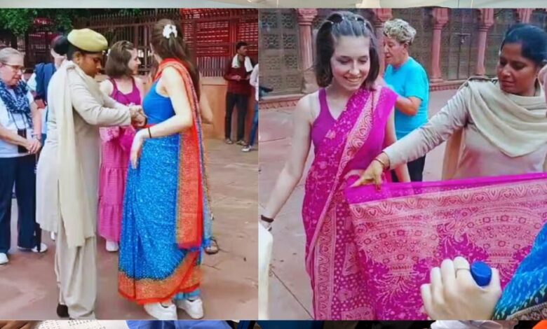 ताजमहल का पश्चिमी गेट. पर्यटकों की भीड़, संगमरमर की चमक, और उसके बीच नीली-गुलाबी साड़ी में इटली से आईं दो महिलाएं एलिसिया और ब्रूना. हवा तेज़ थी, साड़ी उड़ रही थी. पल्लू बार-बार नीचे गिर रहा था. उन्होंने कई बार कोशिश की, प्लेट्स बनाईं, लेकिन साड़ी सही नहीं हो रही थी. आसपास मौजूद लोग वीडियो बनाने , लोग लेकिन किसी ने पास आकर मदद नहीं की. तभी सामने आई यूपी पुलिस की महिला सिपाही लक्ष्मी देवी. लक्ष्मी न तो घबराईं, न झिझक दिखी. एक प्यारी-सी मुस्कान के साथ उन्होंने कहा May I help you?